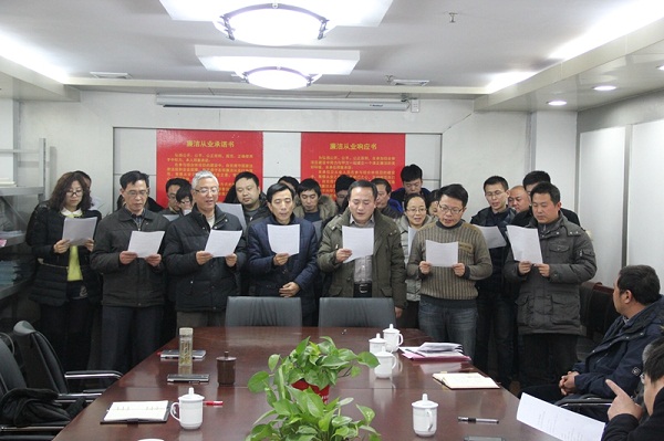 會議由建工控股公司紀委書記錢啟明主持。會上控股公司紀委副書記陳緒寶傳達了省、市有關廉政建設的文件精神,帶領地產員工認真學習了中共中央辦公廳、國務院辦公廳近日印發的《關于做好2015年元旦春節期間有關工作的通知》等文件。錢啟明書記指出:要在地產板塊營造陽光、誠信、廉潔的氛圍,首先要自覺加強學習、提高思想修養,樹立正確的人生觀、價值觀;其次要嚴格工作制度、規范工作程序;第三要堅持嚴肅的懲處違法違紀行為。地產公司董事長程杰最后對全體員工進一步提出四條要求:第一,要牢記自己的身份,時刻保持廉潔自律;第二領導要以身作則;第三要規范管理體系;第四要走正路、大路,陽光路。